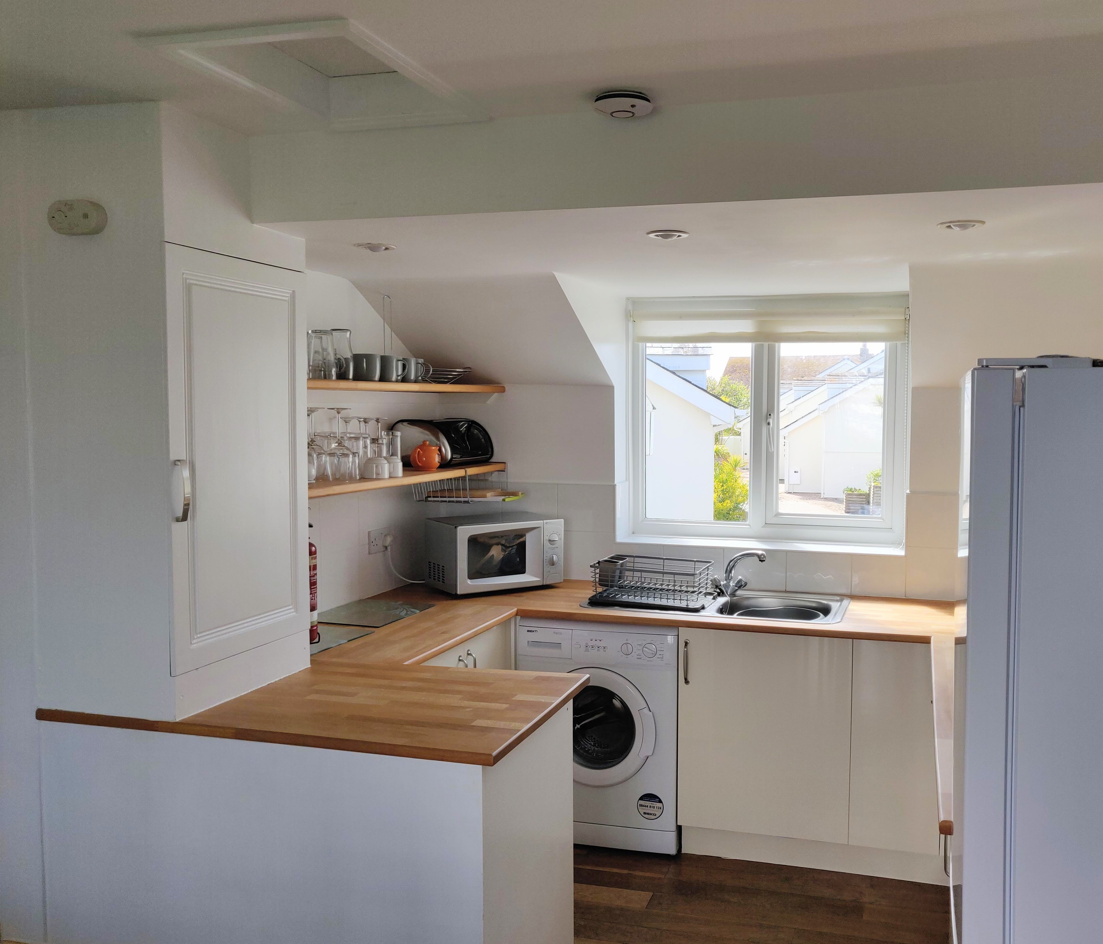 Fully equipped with a range of utensils and accessories including a microwave, toaster, kettle and cafetiere